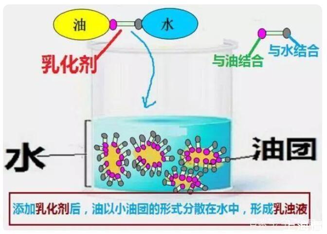 兩種互不相容的液體混合到一起,不管怎么攪拌,只要靜置一段時間,它們就又會出現分層的現象。這是表面張力的作用,液滴中的不溶液滴聚集,最終只能向分層的狀態(tài)變化。而如果加入了乳化劑,情況就不一樣了,由于乳化劑既有親水基團,又有疏水基團,所以構成了兩種液體之間的橋梁。