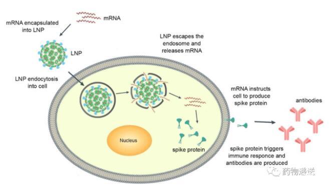 脂質納米粒最新的成功案例是作為遞送載體用Pfizer/BioNTech和Moderna獲FDA批準的兩種COVID-19信使RNA(mRNA)新冠疫苗,這兩款疫苗以無與倫比的速度開發上市,并在流行病毒預防方面有著顯著的效果。疫苗將編碼SARS-CoV-2刺突蛋白的mRNA遞送到宿主細胞的細胞質中,被翻譯成刺突蛋白充當抗原,對病毒產生免疫反應。