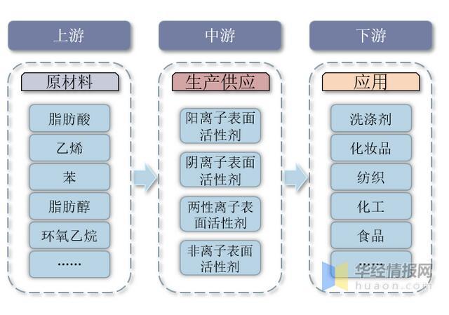 表面活性劑行業產業鏈上游主要為脂肪酸、乙烯、苯、脂肪醇、環氧乙烷等原材料;中游為表面活性劑生產供應環節,主要包括離子和非離子表面活性劑;下游主要應用于洗滌劑、化妝品、紡織、化工、食品等領域。