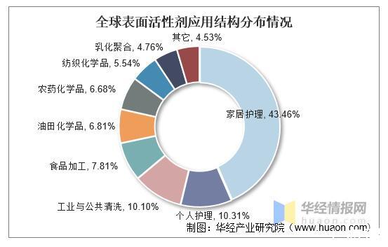 從下游應用結構來看,清潔護理領域是全球表面活性劑最大的下游應用領域,占比超60%。具體來看,家具護理占比為43.46%,個人護理占比為10.31%,工業與公共清洗占比為10.1%。