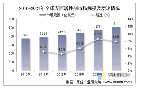 2016-2021年全球表面活性劑市場規模及增速情況