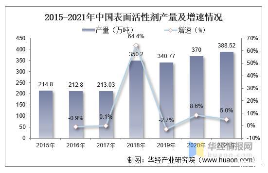 2015-2021年中國表面活性劑產量及增速情況