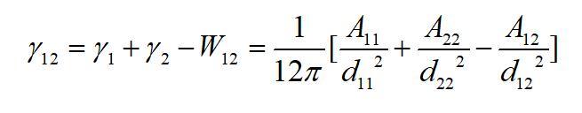 為物質(zhì)1的Hamaker常數(shù)。該作用勢能就相當于本體的內(nèi)聚功。從表面自由能的定義不難看出,當將本體沿本體內(nèi)的一個界面分開時,單位面積需要克服內(nèi)聚力所做的功就等于這個作用勢能。由于分開后形成兩個新表面,因此每個表面上的勢能等于該勢能的一半。因此物體的表面自由能(表面張力)也等于該作用勢能的一半,即