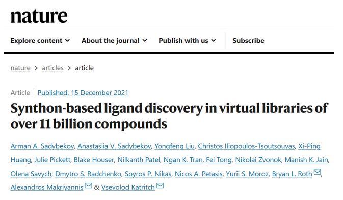 2021年12月15日,美國南加州大學(xué)、東北大學(xué)和北卡羅來納大學(xué)教堂山分校的研究團隊合作,在Nature發(fā)表了題為:Synthon-based ligand discovery in virtual libraries of over 11 billion compounds的研究論文。