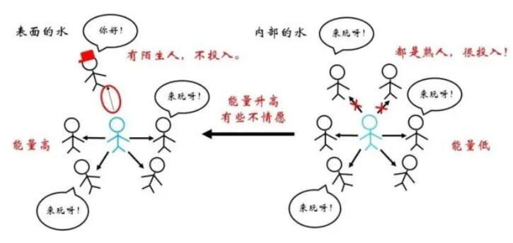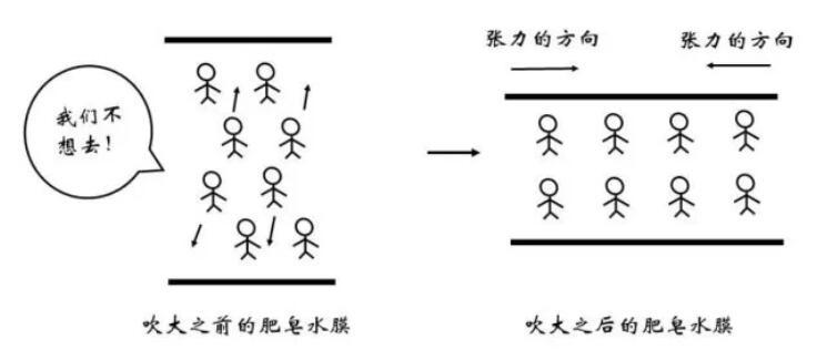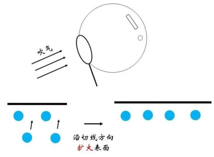 俗話說“物以類聚,人以群分”,更加相似的同類分子間往往關(guān)系更為融洽,而不同種分子間的關(guān)系則相對疏遠。在物理上表現(xiàn)為同類分子間的勢能曲線最低點更低。因此,對于一個存在于內(nèi)部的水分子,如果來到表面,需要斷開與同類分子的部分關(guān)系,而代之以與比較“生疏”的空氣分子間的作用,顯然是不情愿的!這體現(xiàn)為能量的升高。那么,什么情況下水分子要從內(nèi)部來到表面呢?正是吹泡泡的時候。