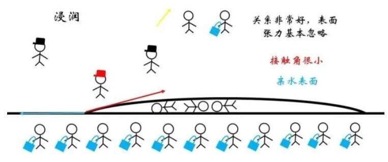 對于浸潤的情況,液體與固體物質(zhì)間的關(guān)系很好,最為極端地可以認為該界面處的表面張力小到可以忽略。這樣一來,需要紅色和藍色的力的水平分量達到平衡,液滴的形狀趨于扁平。一般將氣液界面處張力與液固界面的夾角稱為接觸角,對于浸潤現(xiàn)象顯著的親水表面接觸角很小。