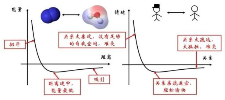 在微觀世界存在著多種多樣的分子,比如上圖所示的氮氣與水分子。分子間組成的體系的勢能與分子間的距離有關(guān)。這種關(guān)系正如兩個人之間的關(guān)系,遠了近了都不好。如果距離太近,彼此之間沒了自我空間,情緒會不穩(wěn)定,因此會產(chǎn)生相互排斥的作用;如果距離太遠,每個人都太孤獨,便會相互思念,彼此吸引。當彼此的距離恰到好處,便對應(yīng)著能量的最低點,較為穩(wěn)定。