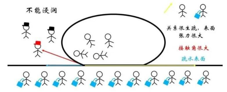 進一步地,就涉及到一個問題:不同物質(zhì)的表面張力的大小與什么有關(guān)呢?在定性上,我們可以引入稱為親和度的概念,它反映了界面兩側(cè)物質(zhì)親疏關(guān)系。如果兩側(cè)的物質(zhì)很親和,那么待在內(nèi)部和表面其實區(qū)別不大,畢竟大家都合得來,因此表面張力相對較小。反之,如果兩側(cè)的物質(zhì)關(guān)系很疏遠,表面張力會很大。而這,正是浸潤現(xiàn)象產(chǎn)生的根源。