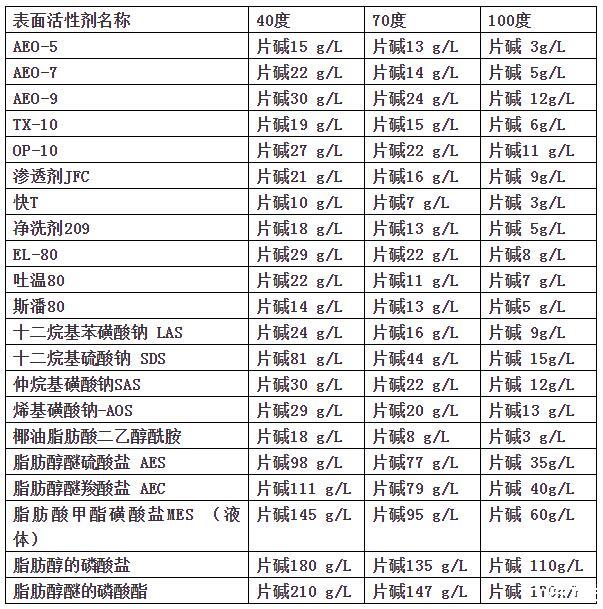 目前常見的表面活性劑耐堿性能如下表: