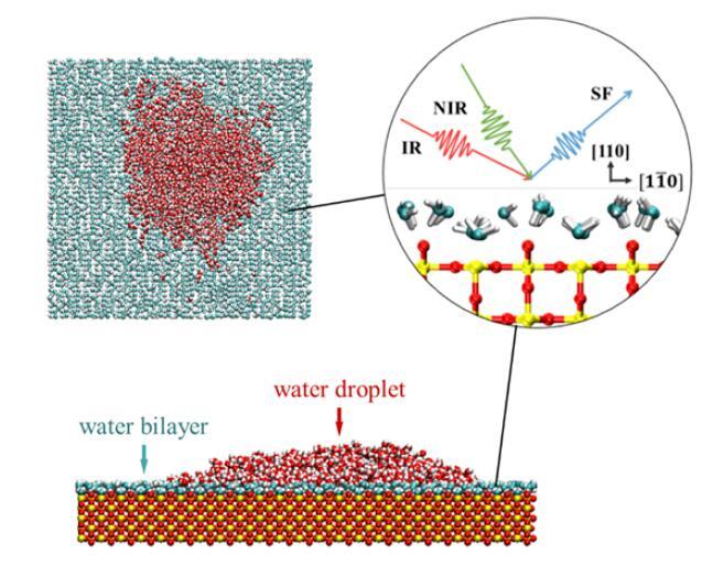 以TiO2的Rutile晶型110表面為例,和頻共振光譜實(shí)驗(yàn)與理論發(fā)現(xiàn)常溫下該表面上有序雙層水結(jié)構(gòu),且該有序結(jié)構(gòu)導(dǎo)致水層上水滴存在。