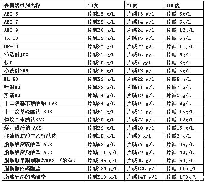 目前常見(jiàn)的表面活性劑耐堿性能如下表: