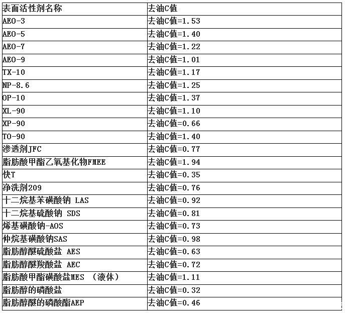 C=試樣去油質(zhì)量/標(biāo)準(zhǔn)配方去油質(zhì)量,C值越大,表明表面活性劑的去油能力越強(qiáng)。