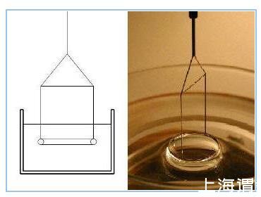 掛環(huán)法(Du Nouy Ring method):這可能是測(cè)量表面/界面張力的最經(jīng)典方法,文獻(xiàn)上報(bào)道的許多液體的表/界面張力值是用這一方法測(cè)得,它甚至可以在很難浸濕的情況下被使用。用一個(gè)初始浸在液體的環(huán)從液體中拉出一個(gè)液體膜(類(lèi)似肥皂泡),同時(shí)測(cè)量提高環(huán)的高度時(shí)所需要施加的力。