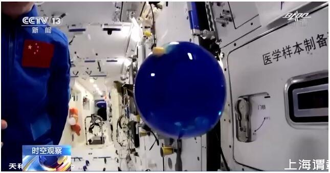 在泡騰片實(shí)驗(yàn)中,王亞平向注入藍(lán)色顏料的水球中放入泡騰片,泡騰片入水后產(chǎn)生大量氣泡。