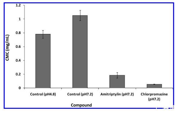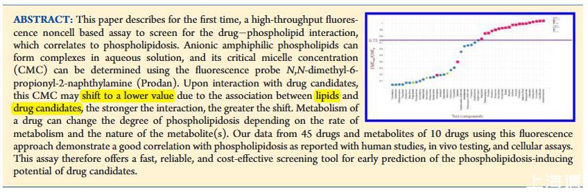 本文首次描述了一種與磷脂質(zhì)相關(guān)的高通量熒光。陰離子兩親磷脂可以在水溶液中形成復(fù)合物,其臨界膠束濃度(CMC)可以使用熒光探針N,N-二甲基-6-丙酰-2-萘胺(Prodan)測定。在與候選藥物相互作用時,由于脂質(zhì)和候選藥物之間的關(guān)聯(lián),該CMC可能會轉(zhuǎn)變?yōu)檩^低的值,相互作用越強,轉(zhuǎn)變越大。藥物的代謝可以根據(jù)代謝速率和代謝物的性質(zhì)改變磷脂質(zhì)的程度。我們使用這種熒光方法從45種藥物和10種藥物的代謝物獲得的數(shù)據(jù)證明了與人體研究、體內(nèi)測試和細胞分析報告的磷脂沉積癥有良好的相關(guān)性。因此,該測定提供了一種快速、可靠且具有成本效益的篩選工具,用于早期預(yù)測候選藥物的磷脂沉積誘導(dǎo)潛力。