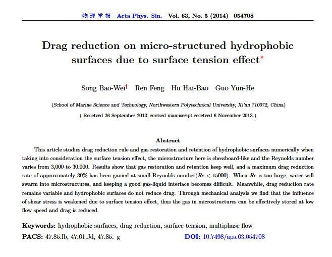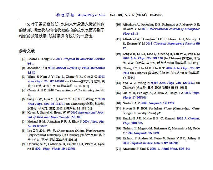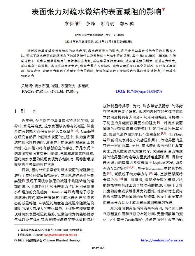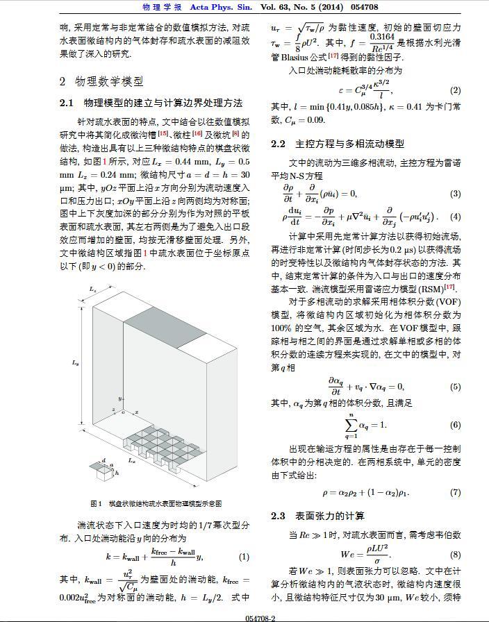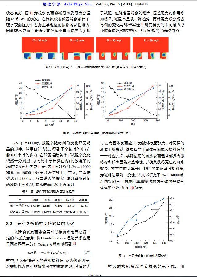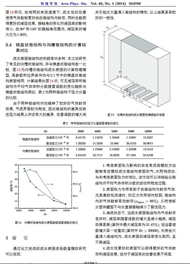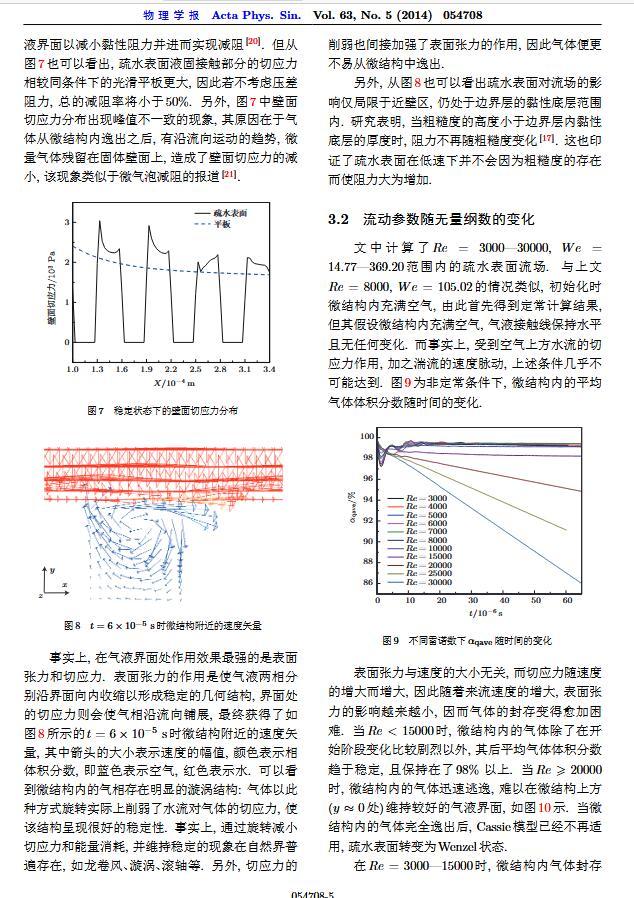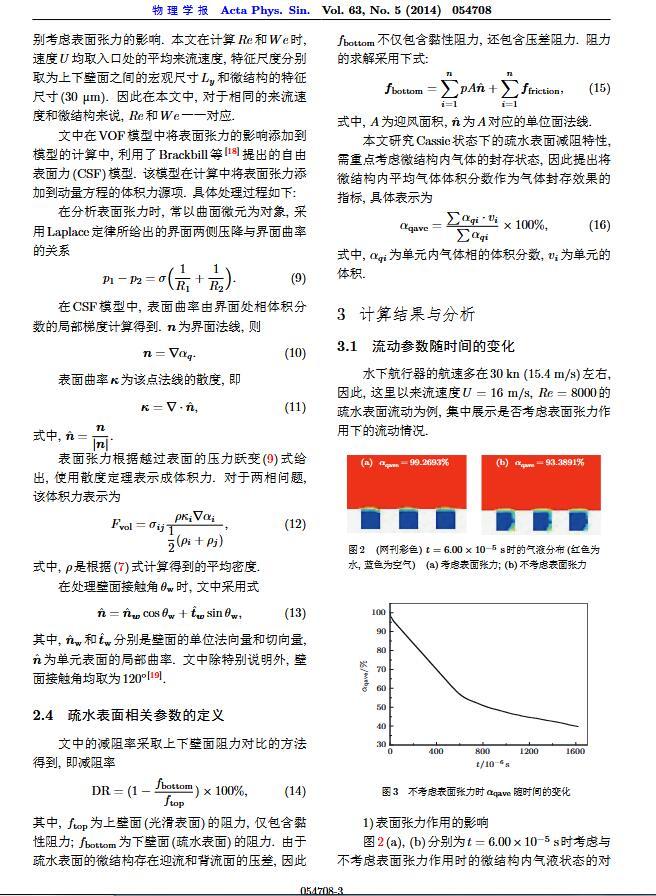 通過構造具有棋盤狀微結構的疏水表面,考慮表面張力的影響,利用定常與非定常結合的數(shù)值模擬方法,研究了疏水表面在湍流狀態(tài)下的減阻特性以及微結構內(nèi)氣體封存的效果,其中Re=3000—30000.在低雷諾數(shù)下,疏水表面微結構內(nèi)氣體封存狀態(tài)良好,減阻率最高約為30%;隨著雷諾數(shù)的增大,壓差阻力增大,減阻率有下降趨勢.當來流速度過大時,水會大量進入微結構,疏水表面的減阻率變化劇烈,且已經(jīng)不再減阻.結果表明,表面張力削弱了壁面切應力的影響,使得低雷諾數(shù)下微結構內(nèi)氣體能夠有效封存,進而減小壁面阻力.