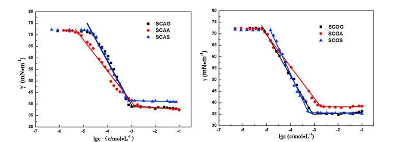 圖1 6種來自蓖麻油(左)和棉籽油(右)的酰基氨基酸表面活性劑在25°C下的表面張力曲線。畫線以顯示斷點。