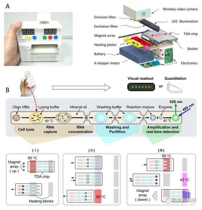 分子診斷是新興的檢驗(yàn)醫(yī)學(xué)領(lǐng)域。隨著熒光定量PCR的推廣,基因檢測(cè)技術(shù)在臨床醫(yī)學(xué)中得到了廣泛應(yīng)用。盡管如此,現(xiàn)有核酸分析平臺(tái)的一些不足之處還是限制了分子診斷技術(shù)的推廣:1)場(chǎng)地要求嚴(yán)格,試劑準(zhǔn)備、核酸提取和擴(kuò)增需要分別在獨(dú)立房間內(nèi)進(jìn)行,極大限制了該技術(shù)在醫(yī)療資源有限條件下的開展;2)采用離線式分析,操作復(fù)雜、分析周期較長(zhǎng),不利于應(yīng)對(duì)突發(fā)性事件;3)現(xiàn)有的熒光定量PCR方法多是針對(duì)單一指標(biāo)檢測(cè)設(shè)計(jì),對(duì)于多重基因檢測(cè)無(wú)論是操作繁瑣程度還是測(cè)試成本均是難以接受的。