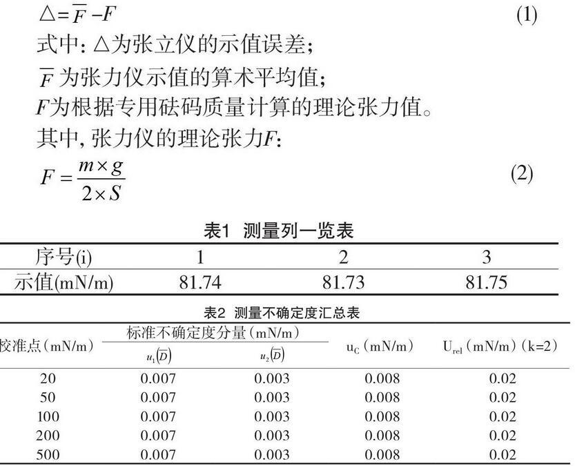 界面張力儀是采用圓環(huán)法在非平衡的條件下,測(cè)量各種液體表面張力及礦物油與水的界面張力,能可靠的指示出親水氧化物的存在情況。對(duì)界面張力儀的校準(zhǔn)研究院用專用砝碼(最大秤量:1000g,MPE:±0.1%)直接測(cè)量張力儀,測(cè)量3次,其3次測(cè)量的算術(shù)平均值與理論值之差即為張力儀張力值的示值誤差[4,5]。