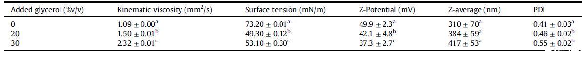 表2甘油對納米顆粒懸浮液物理性質和納米顆粒的粒徑和zeta電位的影響。不同字母表示顯著差異(p<0.05)。