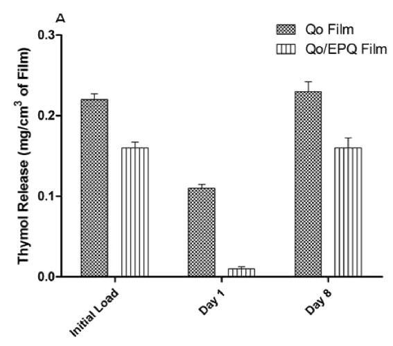 圖6.從使用NQoTh印刷4次的薄膜Qo和Qo/EPQ中釋放百里酚(A)0天(初始負載Th)、第1天和第8天的釋放曲線和(B)室溫下8天測定的百里酚釋放動力學溫度。
