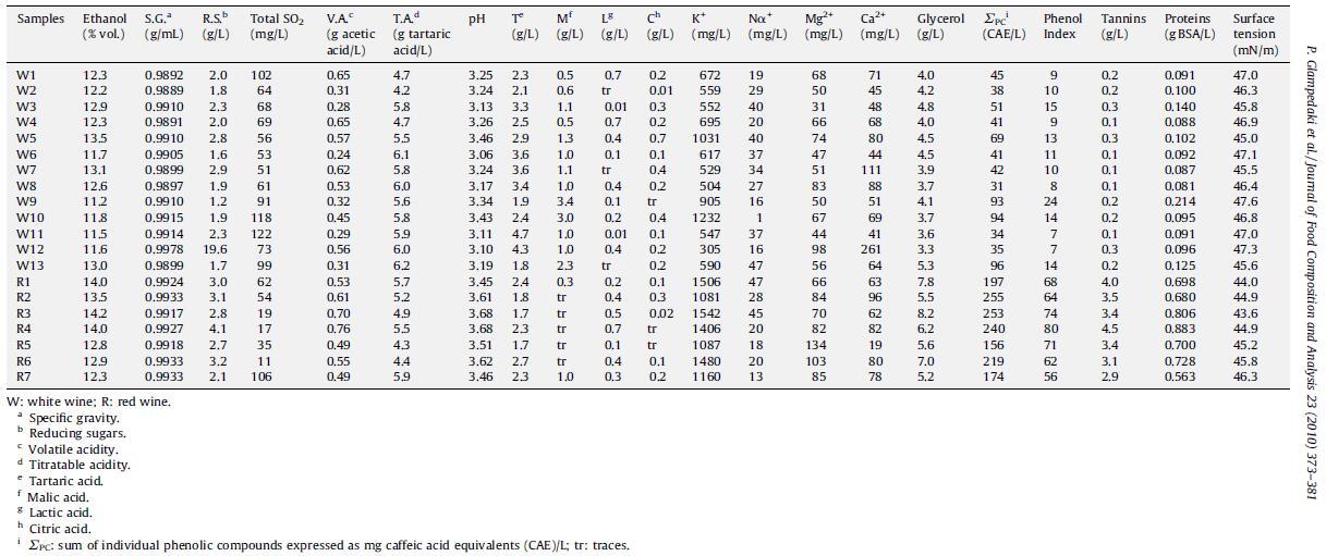 為此,對 20 種靜止、白色和紅色希臘單品種葡萄酒樣品進行了常規(guī)釀酒學(xué)參數(shù)(乙醇含量、比重、還原糖、可滴定酸度、揮發(fā)性酸度、總 SO2 和 pH 值)和表面張力的測定。 還進行了使用 HPLC 測定有機酸(酒石酸、蘋果酸、乳酸和檸檬酸)、陽離子(鉀、鈉、鎂和鈣)、甘油和酚類化合物以及使用氣相色譜法測定揮發(fā)性化合物的基本儀器分析。 最后,采用光譜法進行總酚指數(shù)、單寧和蛋白質(zhì)測定。 結(jié)果如表 2 和表 3 所示。關(guān)于蛋白質(zhì)測定,可能影響所有樣品的系統(tǒng)分析誤差可視為不影響最終值,因為所研究的葡萄酒具有相似的乙醇含量。 此外,在葡萄酒樣品中加入已知量的標準 BSA 溶液進行的分析未發(fā)現(xiàn)對蛋白質(zhì)測定有任何干擾(數(shù)據(jù)未顯示)。 上述數(shù)據(jù)與表面張力的相關(guān)性分析結(jié)果如表4所示。