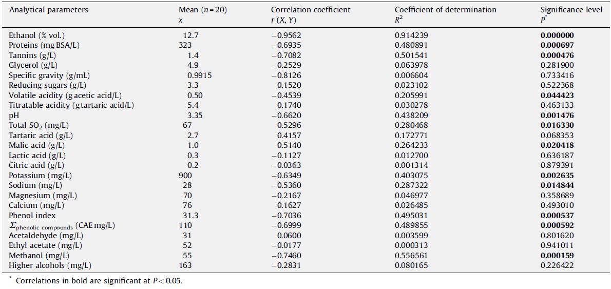 統(tǒng)計分析顯示,在檢查的 24 個分析參數(shù)中,有 12 個與表面張力顯著相關(guān)(P < 0.05)(表 4)。 其中有 10 個(乙醇、蛋白質(zhì)、單寧、揮發(fā)性酸度、pH、鉀、鈉、甲醇和總酚——280 nm 吸光度和 HPLC 測定)具有負相關(guān)系數(shù),表明它們與表面張力成反比,較高的它們的值,樣品的表面張力越低。 另外兩個(蘋果酸和總 SO2)具有正相關(guān)系數(shù)。 測量的最小 P 值 (P = 0.000000) 對應(yīng)于乙醇,第二小 (P = 0.000476) 對應(yīng)于單寧,表明這兩個參數(shù)與表面張力的相關(guān)性最好。 不出所料,還原糖和比重根本沒有關(guān)聯(lián),因為糖分子表現(xiàn)出高水溶性并且?guī)缀鯖]有表面活性。