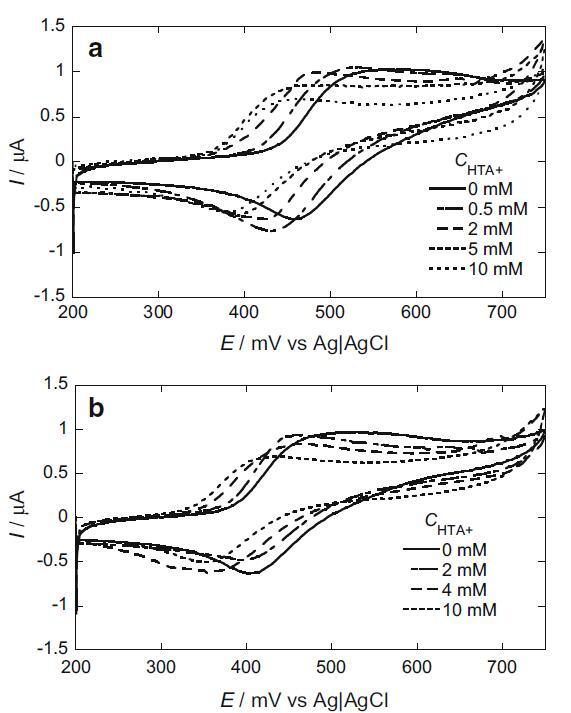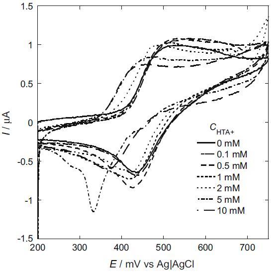 我們還研究了 HTA+ 陽(yáng)離子的影響(圖 6)。 來(lái)自界面張力測(cè)量的 HTA+ 離子的 cmc 與圖 6 標(biāo)題中所述的 CV 測(cè)量溶液相同,為 3.95 mM。 I2/I? 的陽(yáng)極和陰極峰均高于不存在 HTA+ 時(shí)的峰。 陽(yáng)極和陰極峰值電流的增加是由于被捕獲的 I? 和 I2 從 hp-β-CD 釋放到主體中,這是由 hp-β-CD 腔中的 I? 和 I2 置換引起的與 HTA+。 另一方面,隨著 HTA+ 的濃度增加到 cmc 以上,陽(yáng)極和陰極峰值電流都變得低于預(yù)膠束濃度下的峰值電流。 在 I2 和 I- 鍵合到膠束經(jīng)歷電子轉(zhuǎn)移之前,膠束必須轉(zhuǎn)向,使 I2 和 I- 面向電極表面。 它導(dǎo)致峰值電流的降低。 此外,陽(yáng)極和陰極峰值電位都向負(fù)方向移動(dòng)。 這表明溶解在 HTA+ 膠束中的 I2 比鍵合到 HTA+ 膠束表面的 I- 更穩(wěn)定。 隨著 HTA+ 濃度增加到 5 mM,在 330 mV 處觀察到一個(gè)尖銳的吸附減少峰。 已知在不存在任何表面活性劑的情況下,在鉑電極表面形成的 I2 會(huì)吸附在電極表面 [19]。 在我們的系統(tǒng)中,HTA+ 在低 HTA+ 濃度下抑制了 I2 的吸附。 然而,隨著HTA+濃度的增加,形成了HTA+單層,導(dǎo)致電極表面HTA+單層中的I2被吸收。 隨著 HTA+ 濃度增加至 10 mM,吸附還原峰消失。 在這個(gè)濃度下,在電極表面形成的 I2 溶解到 HTA+ 膠束中。 因此,沒(méi)有觀察到吸附峰。