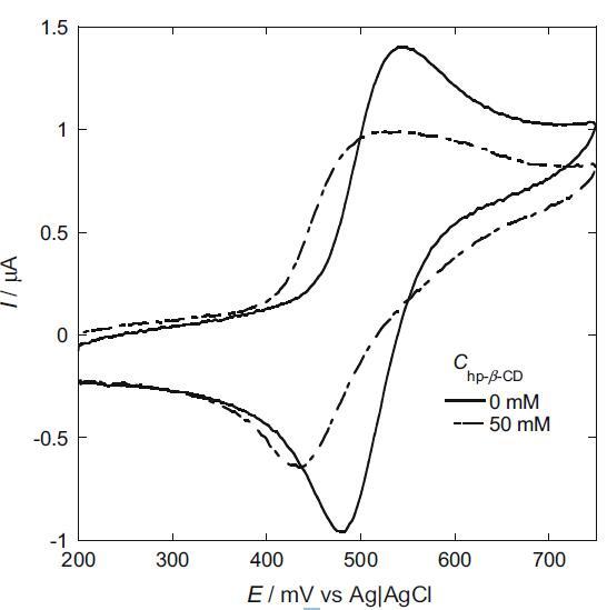 在這里,我們選擇 I2/I? 作為電化學(xué)探針,因?yàn)?I? 的電荷有望使其與陽(yáng)離子膠束的結(jié)合變得容易,并且電中性 I2 有望在膠束中表面活性劑的疏水部分之間增溶并溶解在電極表面的表面活性劑單層中。 我們研究了 hp-β-CD 對(duì) I2/I- 氧化還原峰的影響(圖 5)。 在沒(méi)有 hp-β-CD 的情況下,觀察到 I- 在約 530 mV 處的陽(yáng)極峰和 I2 在約 480 mV 處的陰極峰。 在 50 mM hp-β-CD 存在下,陽(yáng)極和陰極峰值電流均降低,并且它們的峰值電位向負(fù)方向移動(dòng)。 陽(yáng)極峰值電流的降低是由 I? 與 hp-β-CD 的親水表面結(jié)合引起的。 另一方面,陰極峰值電流的降低是由 hp-β-CD 疏水腔中包含 I2 引起的 [18]。 峰值電位的負(fù)移表明結(jié)合在 hp-β-CD 腔中的 I2 比結(jié)合到 hp-β-CD 表面的 I- 更穩(wěn)定。