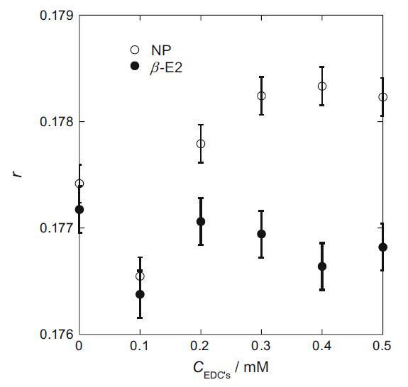 RB 分子在膠束表面區(qū)域溶解得越硬,r 值越大[15]。 r 值的變化如圖 3 所示。在 0.1 mM 時(shí),r 值下降。 這表明 EDCs 開(kāi)始溶解到膠束中擾亂了 RB 分子在膠束表面的緊密堆積。 隨著NP濃度的增加,r值增加。 然而,隨著β-E2濃度的增加,r值一度恢復(fù)并似乎一點(diǎn)點(diǎn)下降。 這表明 NP 的增溶使膠束表面更加剛性,而 β-E2 的增溶則沒(méi)有。 NP在結(jié)構(gòu)上更類(lèi)似于HTA+。 因此,NP在膠束中的HTA+離子頭之間增溶,降低了膠束表面離子頭的靜電斥力,使膠束更加穩(wěn)定和剛性[16]。 另一方面,β-E2 似乎會(huì)干擾 HTA+ 的取向并降低膠束表面的剛度。