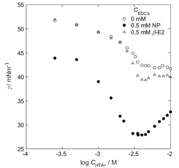 表 2 在含有 0.49 M Na2SO4 和 0.01 M H2SO4 的 5 mM hp-β-CD 存在下,HTA+ 溶液在不同 NP 或 β-E2 濃度下的 cmc 和表面過(guò)量 (Γmax) 值