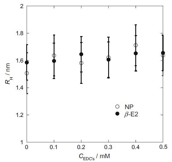 我們?cè)诿總€(gè) EDC 存在下通過(guò)動(dòng)態(tài)光散射方法研究了 HTA+ 膠束的 RH(圖 4)[17]。 隨著 EDCs 濃度的增加,膠束的流體動(dòng)力學(xué)半徑似乎逐漸增加。