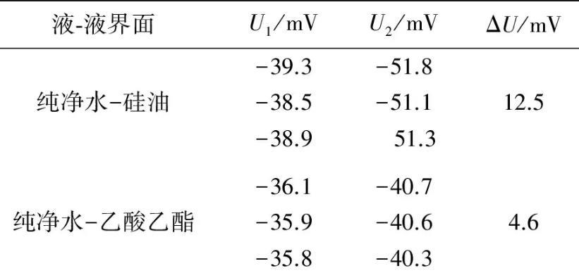 實驗測量所用金屬吊環(huán)的外徑、內徑分別為0.034 96 m和0.033 10 m.在20℃實驗條件下,采用自制2種液體間界面張力的動態(tài)實時測量儀,測量了純凈水-硅油和純凈水-乙酸乙酯間的界面張力.測量出金屬吊環(huán)由液體I中完全進入液體Ⅱ的過程中,液體I的液膜被拉斷前電壓的最大值U1,拉斷后趨于穩(wěn)定時的電壓值為U2,數據結果如表1所示。