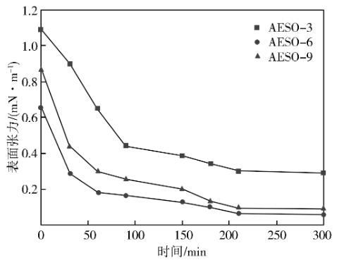 由圖1可以看出,隨著測試時間的推移,脂肪醇聚醚磺酸鹽與煤油之的界面張力逐漸減小并趨于穩定。3種表面活性劑界面張力隨聚合的增大先減小后增大,其中AESO-3界面張力值最大,AESO-6界面張力值最小為6.03×10-2mN/m。
