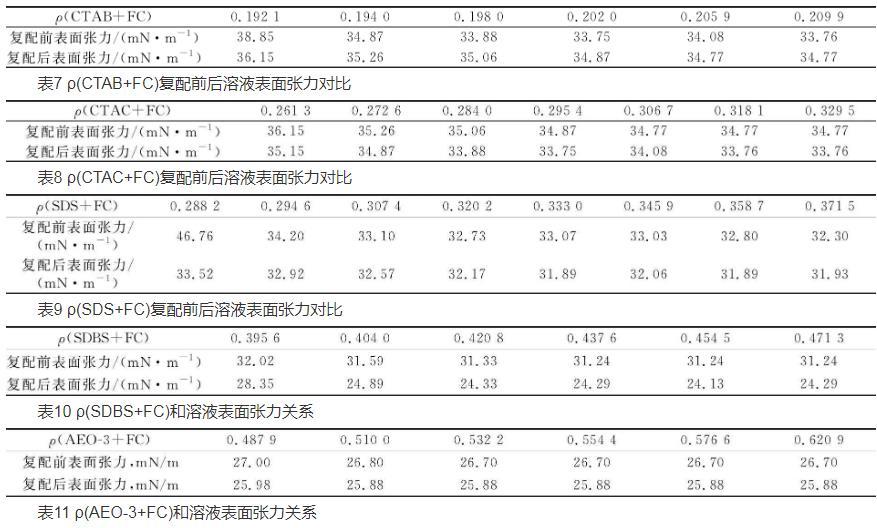 為了更好地提高表面活性劑的性能,降低表面活性劑的應(yīng)用成本,減輕其對(duì)環(huán)境的危害。在室溫下,分別測(cè)試不同濃度的碳?xì)浔砻婊钚詣┡cFC復(fù)配后表面張力的變化,實(shí)驗(yàn)結(jié)果見(jiàn)表7~11。
