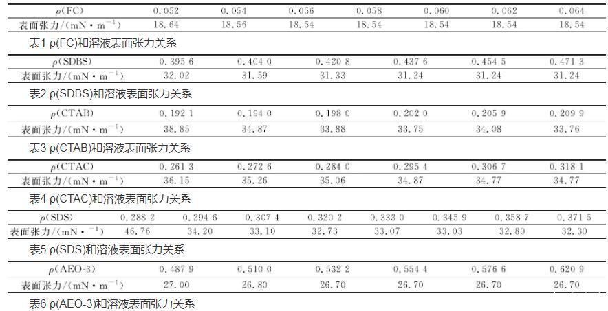 按照實(shí)驗(yàn)方法Hz制備表面活性劑溶液,在室溫下,測(cè)定FC、CTAB、CTAC、SDS、SDBS和AEO-3表面活性劑的表面張力,確定CMC,結(jié)果見(jiàn)表1~6。