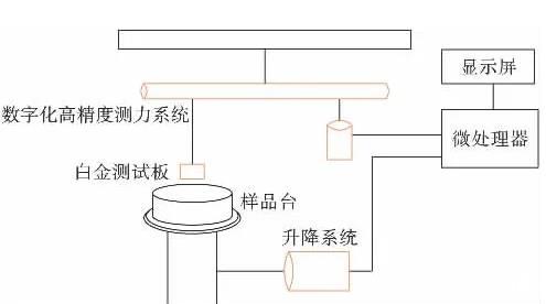圖1為表面張力儀工作系統(tǒng)示意圖。硬件方面主要包括樣品臺(tái)、升降系統(tǒng)、數(shù)字化測(cè)力系統(tǒng)和微處理器。軟件方面由控制、分析專(zhuān)用軟件經(jīng)過(guò)微處理器的一系列運(yùn)算,將檢測(cè)到的微力轉(zhuǎn)化成表面張力值。由LCD數(shù)字顯示屏實(shí)時(shí)輸出表面張力值,如果需要,可通過(guò)RS232接口連接打印機(jī),打印數(shù)據(jù)或經(jīng)計(jì)算機(jī)采集相應(yīng)數(shù)據(jù)。該裝置結(jié)構(gòu)簡(jiǎn)單,操作簡(jiǎn)便,準(zhǔn)確性高。