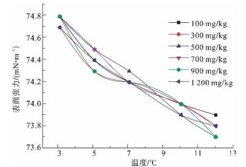 圖7為100、300、500、700、900、1 200 mg/kg濃度下,本實(shí)驗(yàn)自行合成的離子液體[HMIPS]Ss溶液的表面張力隨溫度變化示意圖。在低溫區(qū)間內(nèi)300 mg/kg溶液的表面張力曲線(xiàn)最低,說(shuō)明該濃度的溶液表面活性最強(qiáng)。在所測(cè)溫度范圍內(nèi),整體上表面張力曲線(xiàn)遵循隨溫度升高而表面張力降低的一般規(guī)律,但相差不大,同一條曲線(xiàn)3℃和12℃表面張力值相差0.9~1.1 mN/m。