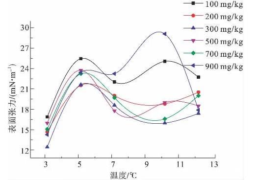 圖5為100、200、300、500、700、900 mg/kg濃度下,陰離子表面活性劑CTAB溶液的表面張力隨溫度變化示意圖。由圖5可知,300 mg/kg溶液的表面張力曲線(xiàn)最低,說(shuō)明該濃度的溶液表面活性最強(qiáng)。在所測(cè)溫度范圍內(nèi),隨溫度升高表面張力變化較大,整體上表面張力曲線(xiàn)呈波浪狀,出現(xiàn)拐點(diǎn)。6條曲線(xiàn)在3℃時(shí)均出現(xiàn)最低表面張力值,在5℃附近均出現(xiàn)波峰;100、500和900 mg/kg溶液在7℃附近時(shí)出現(xiàn)波谷,10℃附近再次出現(xiàn)波峰;200、300和700 mg/kg溶液在10℃附近出現(xiàn)波谷。