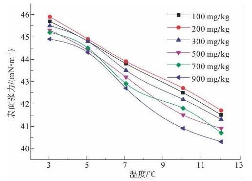 圖6為100、200、300、500、700、900 mg/kg濃度下,非離子表面活性劑P123溶液的表面張力隨溫度變化示意圖。由圖6可知,隨濃度增大,溶液降低表面張力的能力逐漸增大,但各個(gè)濃度曲線(xiàn)差值不大,900 mg/kg濃度溶液表面活性最強(qiáng)。在所測(cè)溫度范圍內(nèi),整體上表面張力曲線(xiàn)幾乎呈直線(xiàn)狀,遵循隨溫度升高而表面張力降低的一般規(guī)律,斜率幾乎不變,未出現(xiàn)拐點(diǎn),且相差較大,同一條曲線(xiàn)3℃和12℃表面張力值相差4.2~4.6 mN/m。