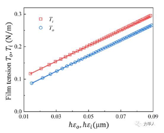 基于該平衡構(gòu)型的解析解,本研究發(fā)現(xiàn)薄膜在接觸線(xiàn)附近的彈性應(yīng)變可以由薄膜的鼓包角解析給出。由此,本文給出了在一般條件下,薄膜在接觸線(xiàn)附近的彈性應(yīng)變隨鼓包角的解析關(guān)系。圖3表明,基于該解析關(guān)系給出的薄膜彈性應(yīng)變可以很好的描述薄膜總張力隨薄膜厚度及接觸線(xiàn)附近應(yīng)變的演化規(guī)律。基于此,本文提出了采用線(xiàn)性外推薄膜總張力隨薄膜厚度和接觸線(xiàn)附近薄膜應(yīng)變乘積的方法來(lái)確定固體表面張力的方案。