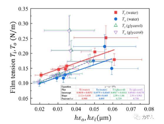 綜上所述,本文基于理論模型揭示了表面張力在調(diào)控液滴-薄膜體系平衡構(gòu)型的作用機(jī)制,首次發(fā)現(xiàn)了薄膜張力隨薄膜鼓包角的非線(xiàn)性解析關(guān)系,以此完善了基于薄膜-液滴體系確定固體表面張力的方案,可用于對(duì)高分子材料表面張力的實(shí)驗(yàn)測(cè)量和探索高分子材料表面張力與表面能的關(guān)系。