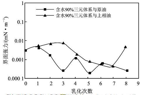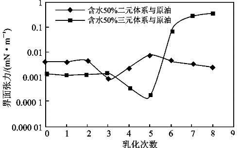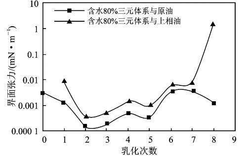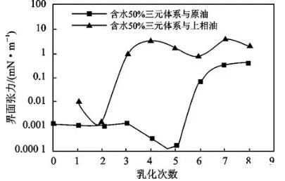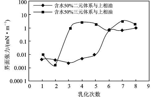 從總體上看,水相與原油間的界面張力低于其與上相油間的界面張力,在乳化第6次以后兩者開始趨同。說明乳化會導(dǎo)致油相中的組成發(fā)生變化,進(jìn)而導(dǎo)致油相性質(zhì)發(fā)生變化。因此在復(fù)合驅(qū)驅(qū)替的適當(dāng)時機應(yīng)對驅(qū)油體系的配方進(jìn)行相應(yīng)調(diào)整。