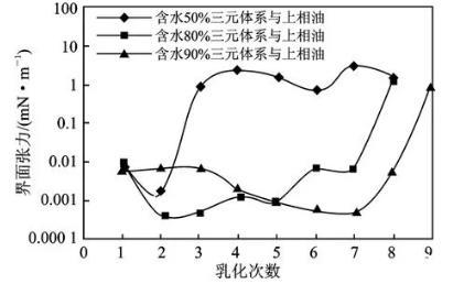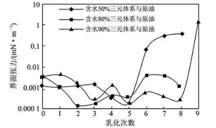 界面張力的高低反應(yīng)體系啟動剩余油的能力,分析含水不同的三元體系多次乳化后與原油間的界面張力見圖1。
